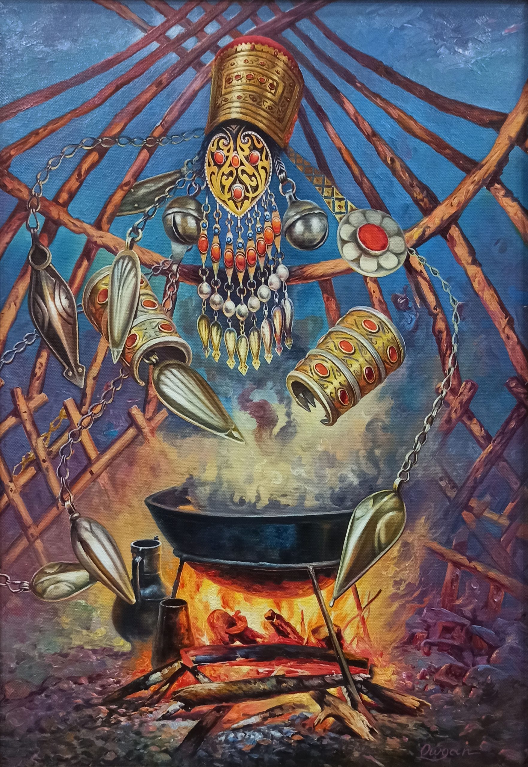 The painting “Shayly Gelin” presents a captivating and surreal depiction of a woman engaged in cooking, her presence felt but not directly visible. Instead, the focus is on the exquisite traditional Turkmen silver jewelry that seems to float in mid-air, suggesting her essence and identity through these ornate adornments.